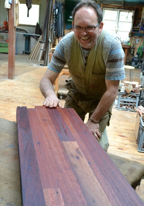 I love using recycled timber like this hundred-year-old redgum benchtop made from crossmembers from an historic Bruny Island telegraph line .